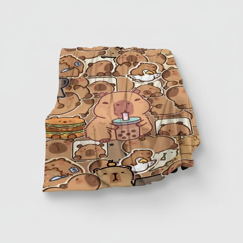 Een heerlijk zachte capybara-deken van 130×150 cm, gemaakt van warm en huidvriendelijk fleece dat direct een gevoel van gezelligheid geeft. De deken toont een schattige capybara-illustratie in zachte, natuurlijke bruintinten, waardoor hij een rustgevende en knuffelige uitstraling heeft. Het materiaal is licht maar toch isolerend, perfect om over je heen te leggen op de bank, in bed of tijdens het lezen. Dankzij het royale formaat biedt de deken voldoende warmte zonder zwaar aan te voelen. Ideaal als sfeervolle toevoeging aan je interieur of als cadeau voor elke capybara-liefhebber die comfort en schattigheid wil combineren.