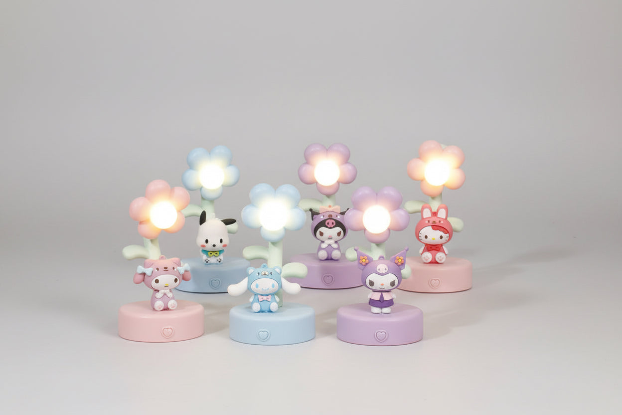 De bloemvormige lamp wordt aangedreven door batterijen, wat betekent dat je hem eenvoudig overal kunt plaatsen zonder afhankelijk te zijn van stopcontacten. De schattige Kuromi-figuur vormt de basis van de lamp en voegt een speelse en vrolijke touch toe aan de ruimte.